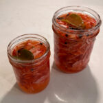 - Use tongs or another utensil to fish out the [optional] kaffir lime leaves and distrubute one to each jar of radishes.